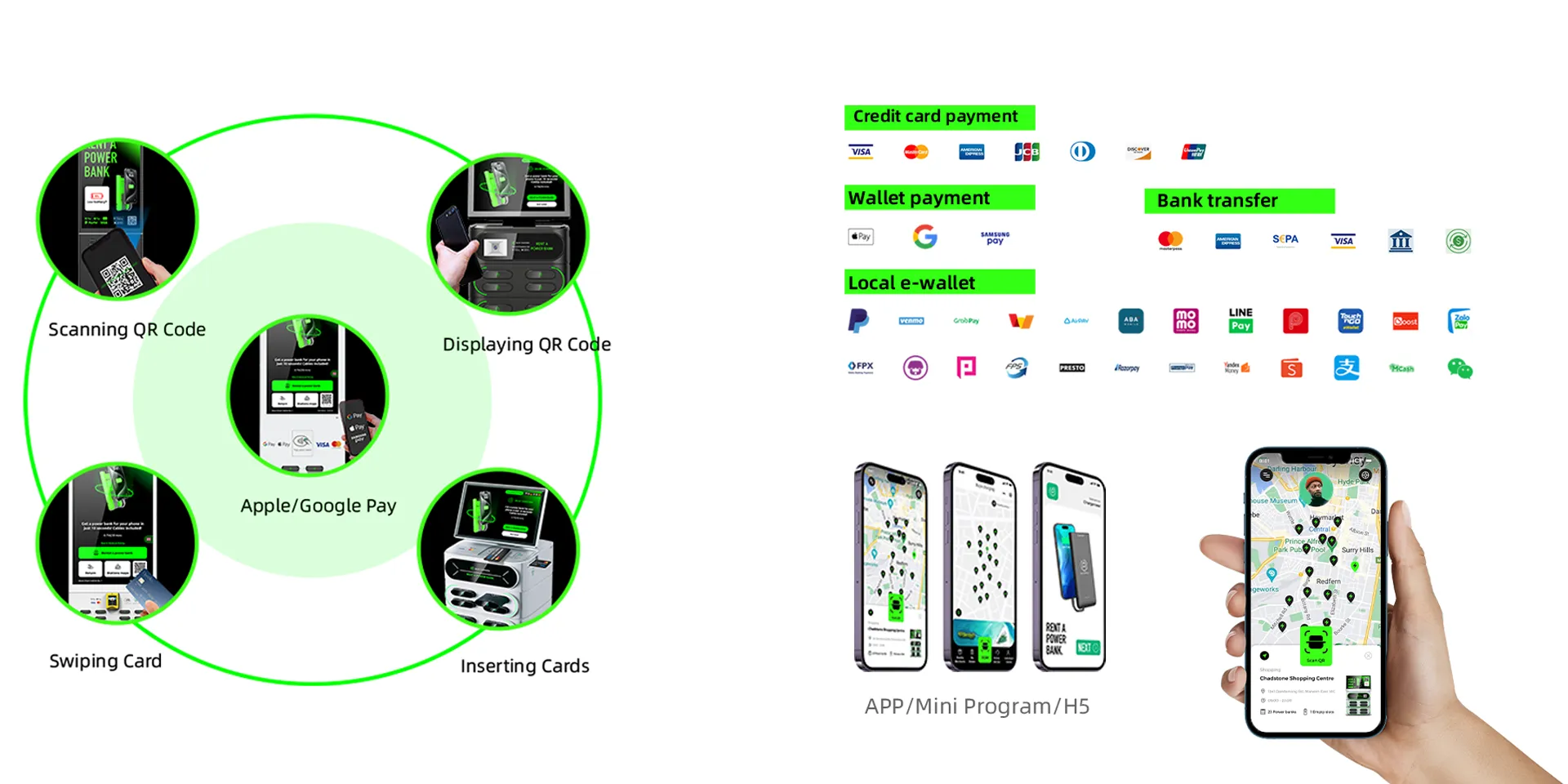 Factories can also customize APPs / mini-programs / H5 platforms for operators, supporting multiple rental methods such as:NFC rental (Apple Pay / Google Pay / Samsung Pay), POS card rental, Camera scanning rental, APP rental, Scan-to-pay rental. The system supports multi-currency payments across different countries and regions, allowing users to rent power bank charging stations conveniently.
