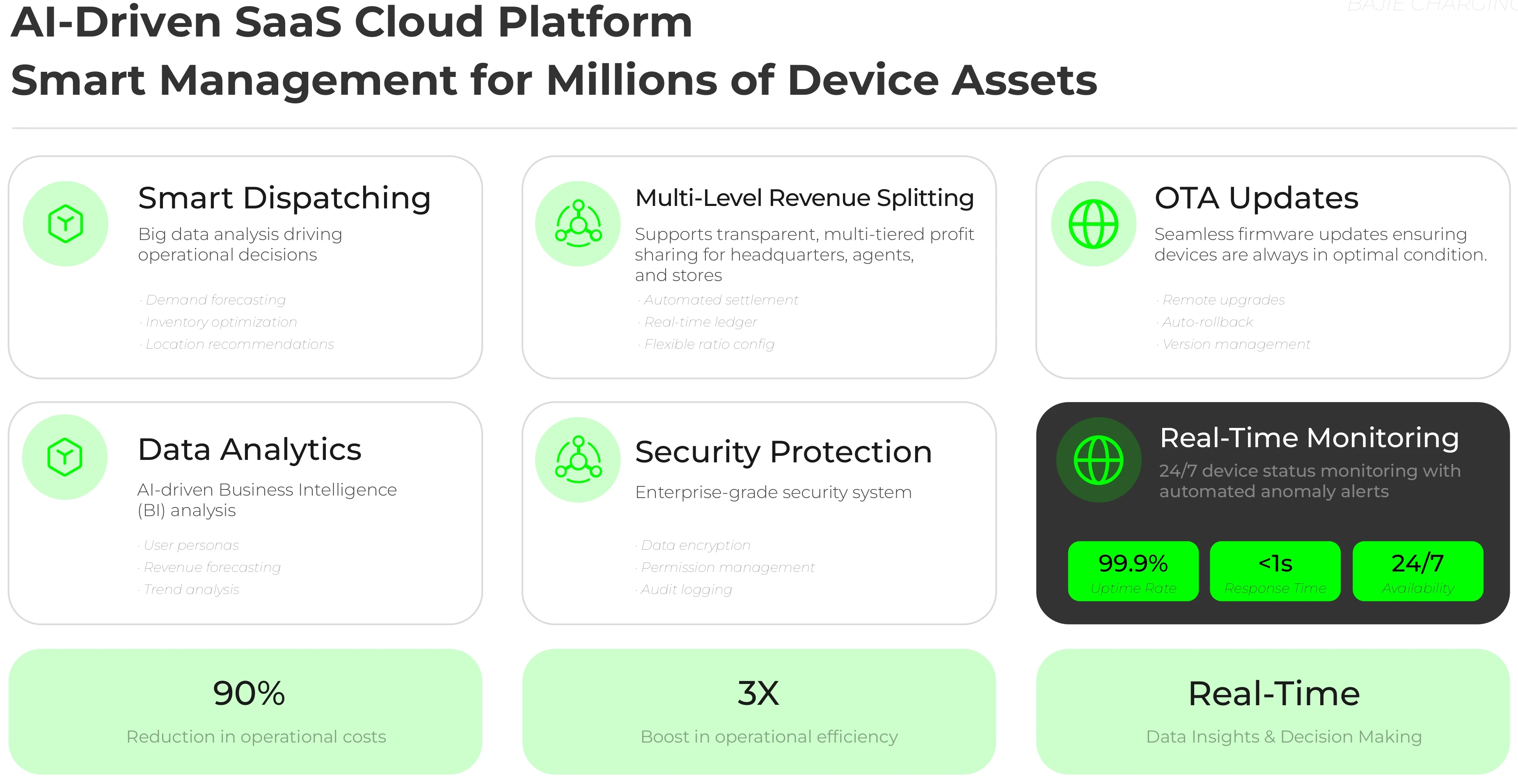 Real-time monitoring and OTA upgrades: ensuring 24/7 stable operation. The system provides round-the-clock device monitoring with automatic alerts for anomalies, maintaining a 99.9% online rate. OTA remote upgrades allow seamless firmware updates, including remote upgrades, automatic rollback, and version management, keeping devices in optimal condition while reducing maintenance costs.