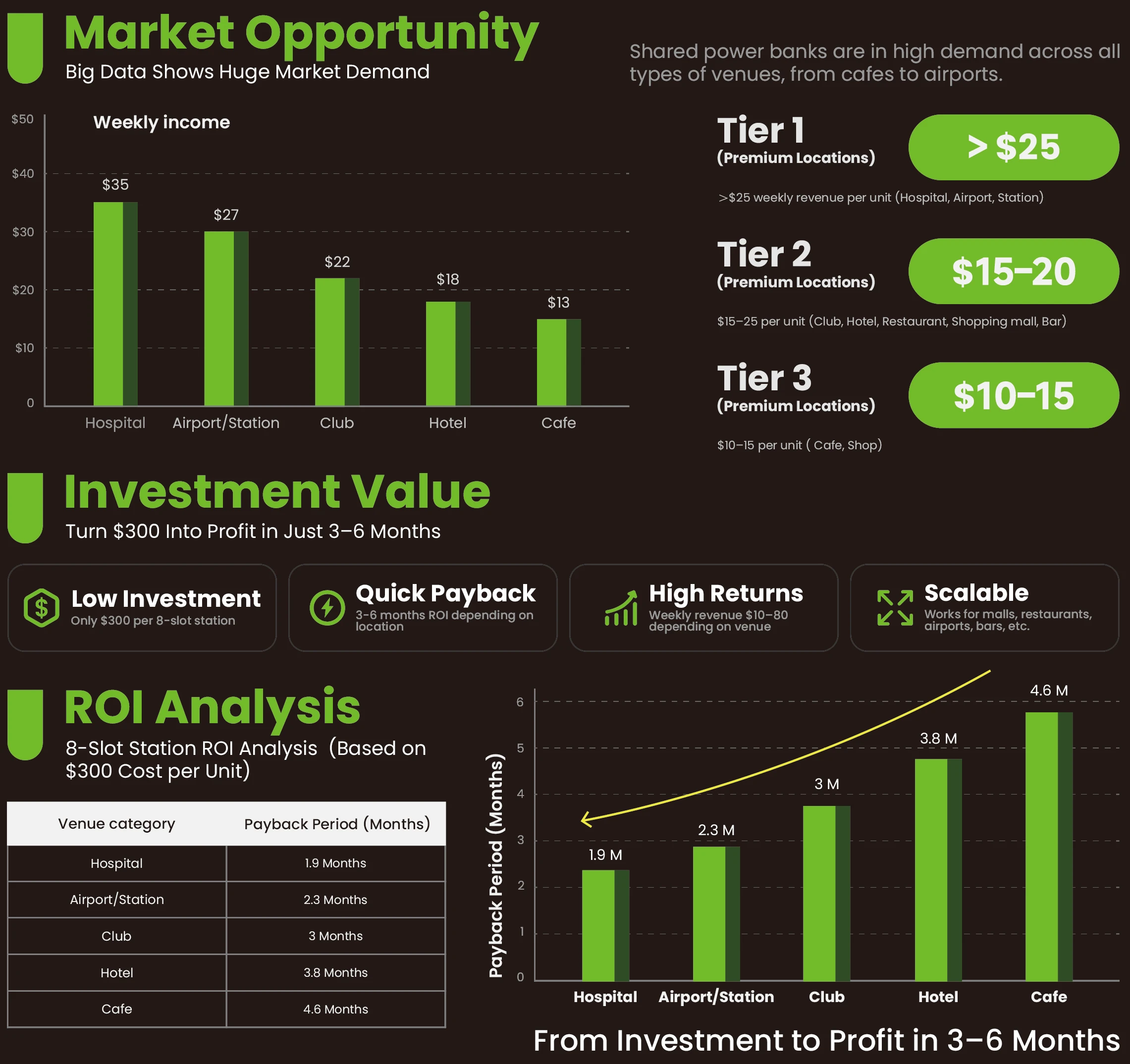Tier 1 premium locations (hospitals, airports, stations):Weekly revenue exceeds $25. Hospitals: up to $35/week → payback in ~1.9 months. Airports/stations: ~$27/week → payback in ~2.3 months. These locations offer high capital turnover efficiency.